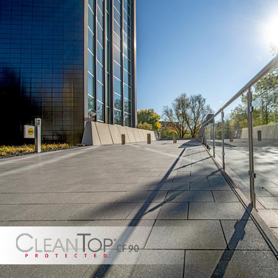 Concrete, as well as natural stone, has fine capillaries which can be penetrated by moisture and dirt. The CleanTop system is part of the production process and therefore permanently bonded in the stone. It protects the stone thoroughly. Depending on the Clean Factor, moisture and dirt cannot infiltrate the stone, or do so only partially. Marks can be quickly and easily removed with water and gentle external cleaning agents. And the surfaces have to be cleaned less often.